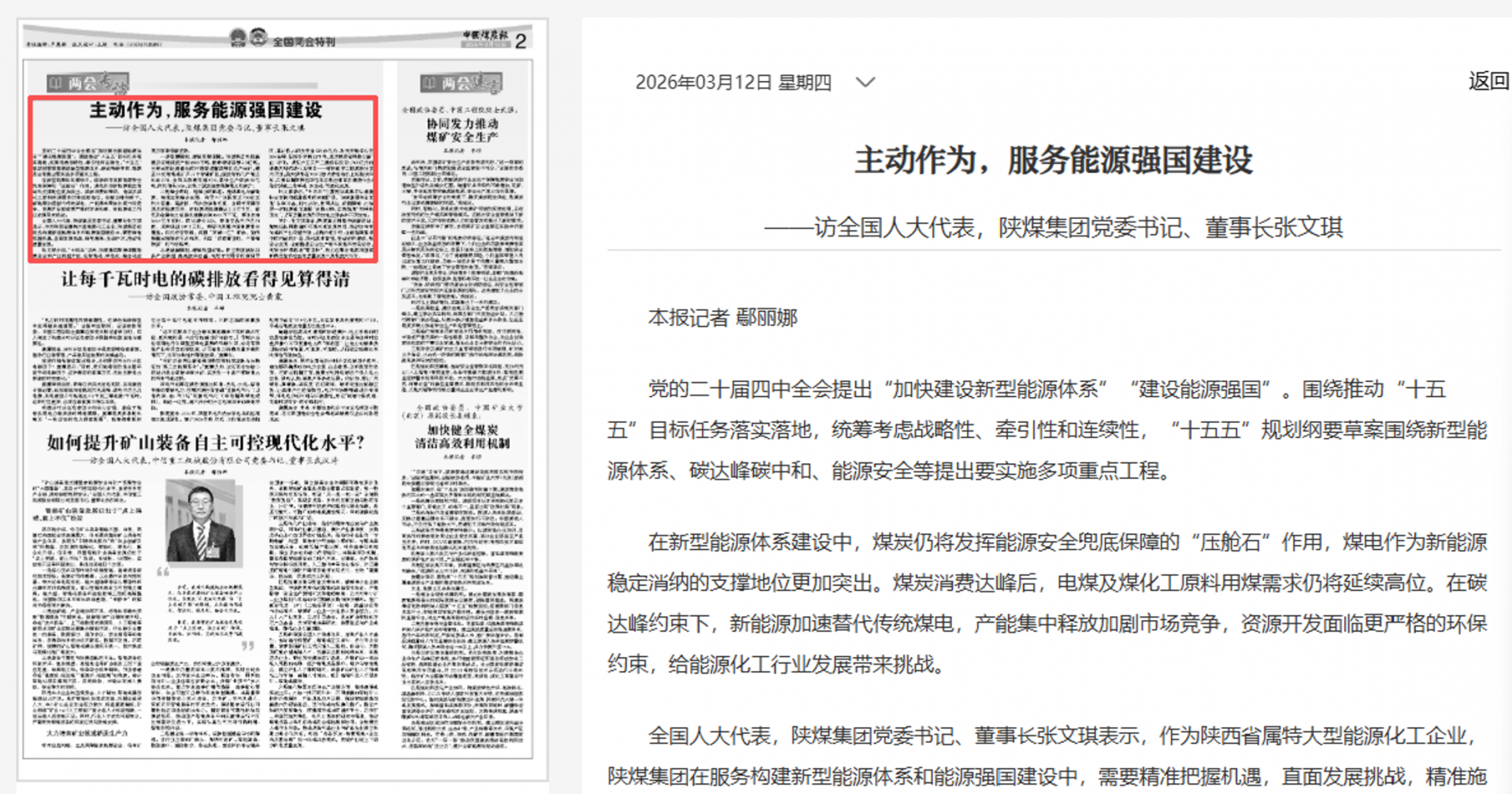 访问次数:10444中国煤炭报 2026年03月12日 2版 全国两会特刊主动作为,服务能源强国建设——访全国人大代表,陕煤集团党委书记、董事长张文琪党... -