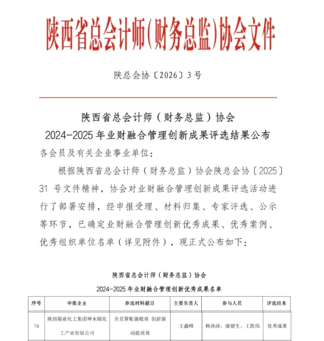 访问次数:12691近日,陕西省总会计师(财务总监)协会公布2024—2025年业财融合管理创新优秀成果评选结果,神木煤化工公司报送的《全员算账强根基 创...