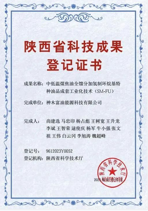 访问次数:3830近日,富油公司自主研发的“中低温煤焦油全馏分加氢制环烷基特种油品成套工业化技术”荣获了陕西省科学技术厅颁发的科技成果登记证书。... -