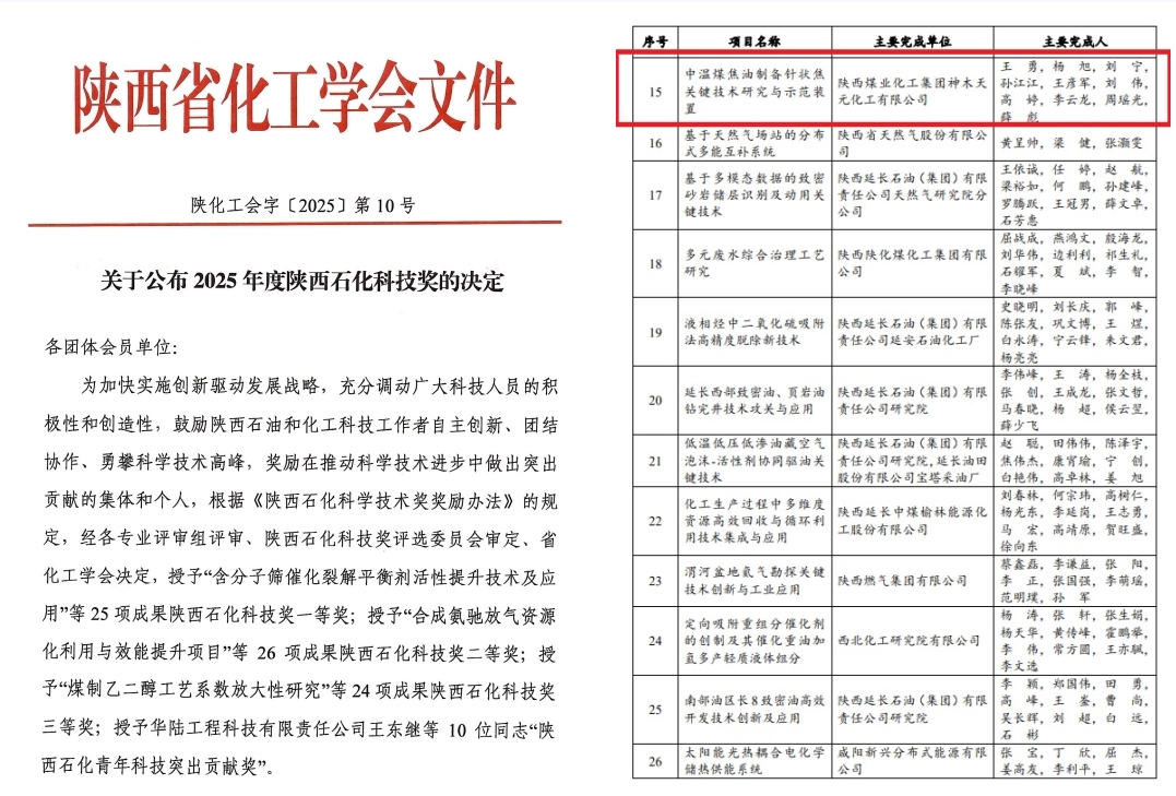 近日,从陕西省化工学会印发《关于公布2025年度陕西石化科技奖的决定》获悉,神木煤化工天元公司“中温煤焦油制备针状焦关键技术研究与示范装置”创新成果荣获2025年度陕西石化科技奖二等奖。