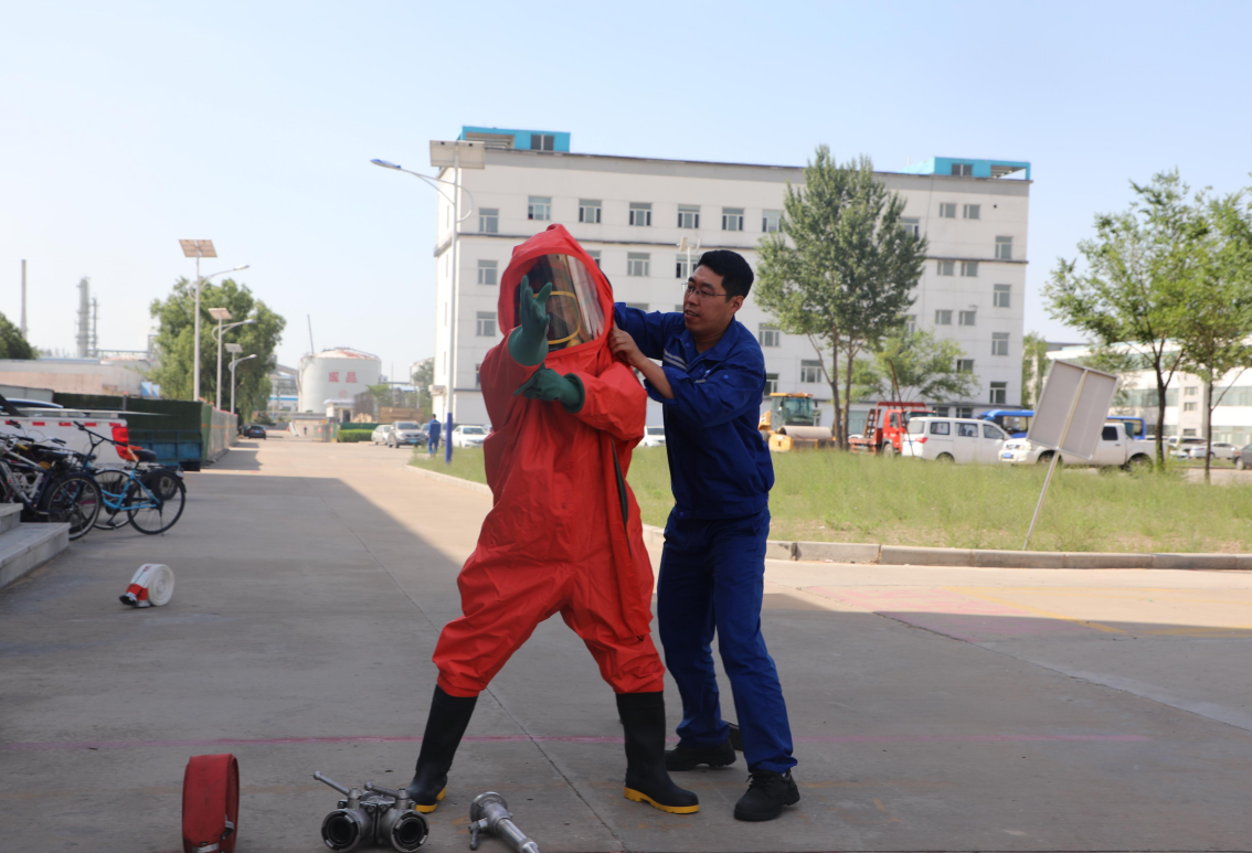 本次比赛,由10个生产车间和质量监督部分别选派2名新员工参加比赛。1号选手先快速背空气呼吸器,在2号选手的协助下穿好防化服后,再由2号选手甩出消防水带,1号选手一手拉着甩出去的水带头,一手拿起消防枪头,边跑边连接水带和枪头,到终点线外并将枪头开关打开,2号选手将水带另一个头连接至分水器上,全部动作完成后,裁判停止计时。竞赛成绩由参赛所用总时间(参赛计时+失误扣分加时)确定,用时最少的队伍获胜。