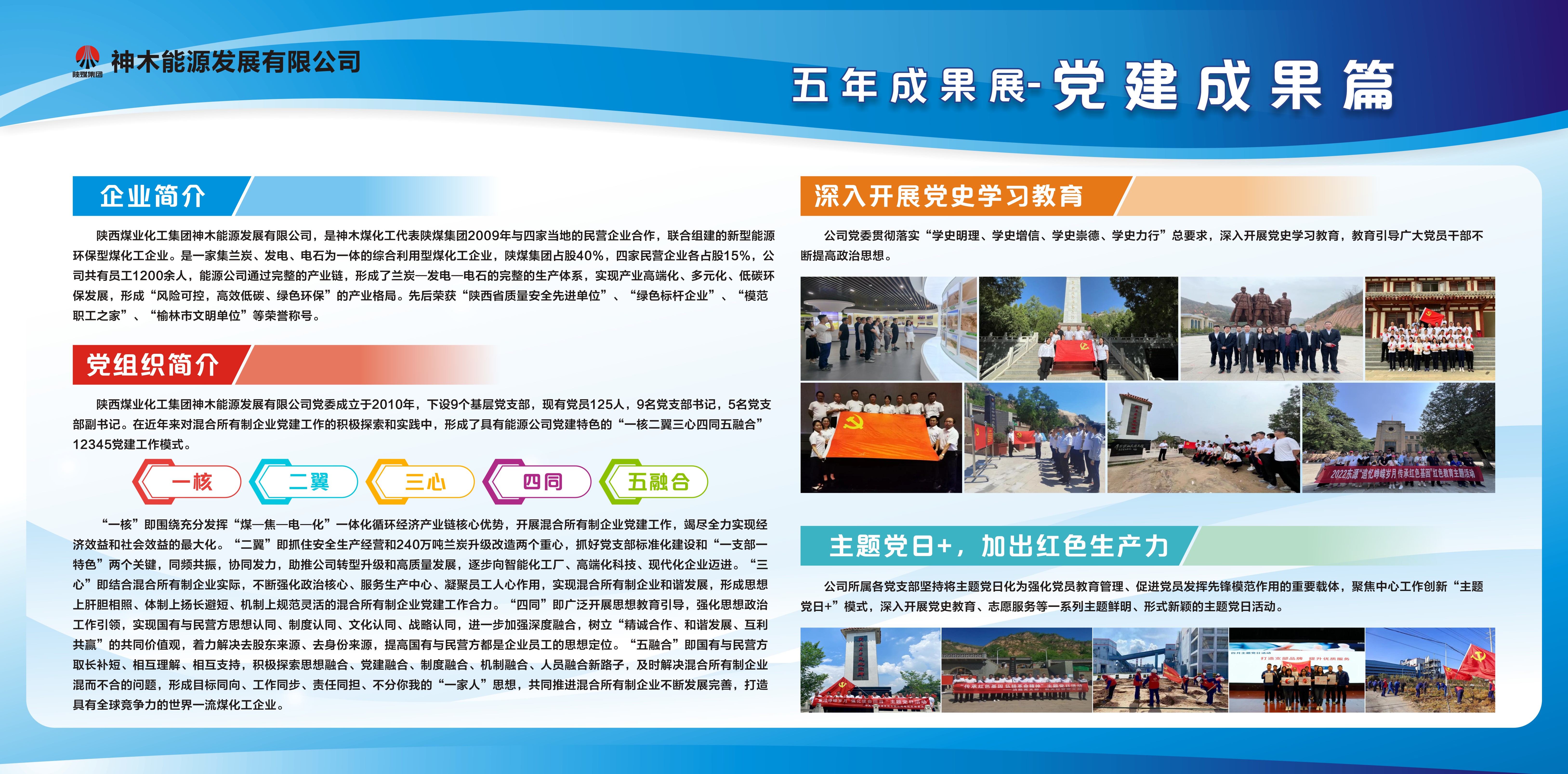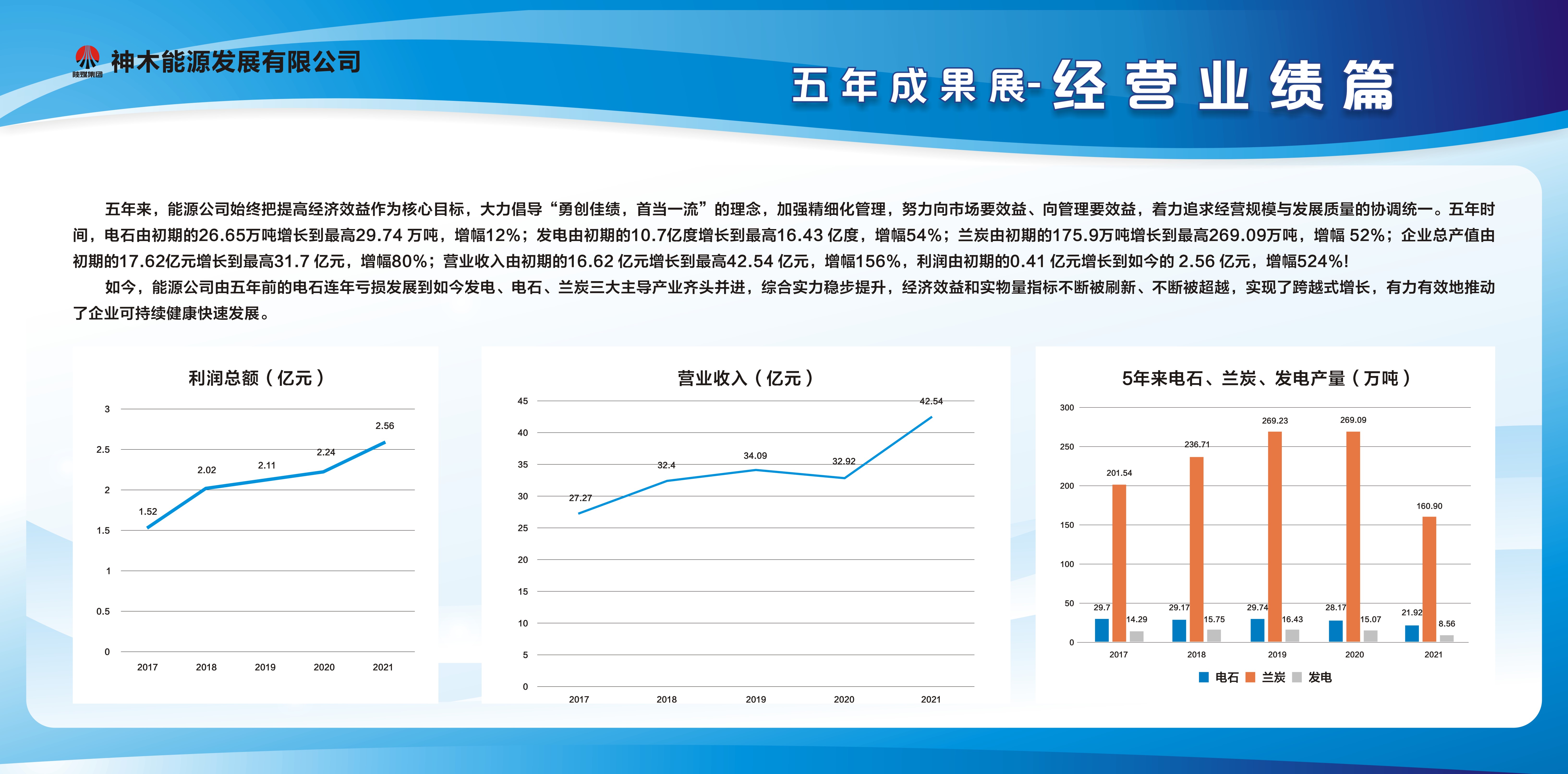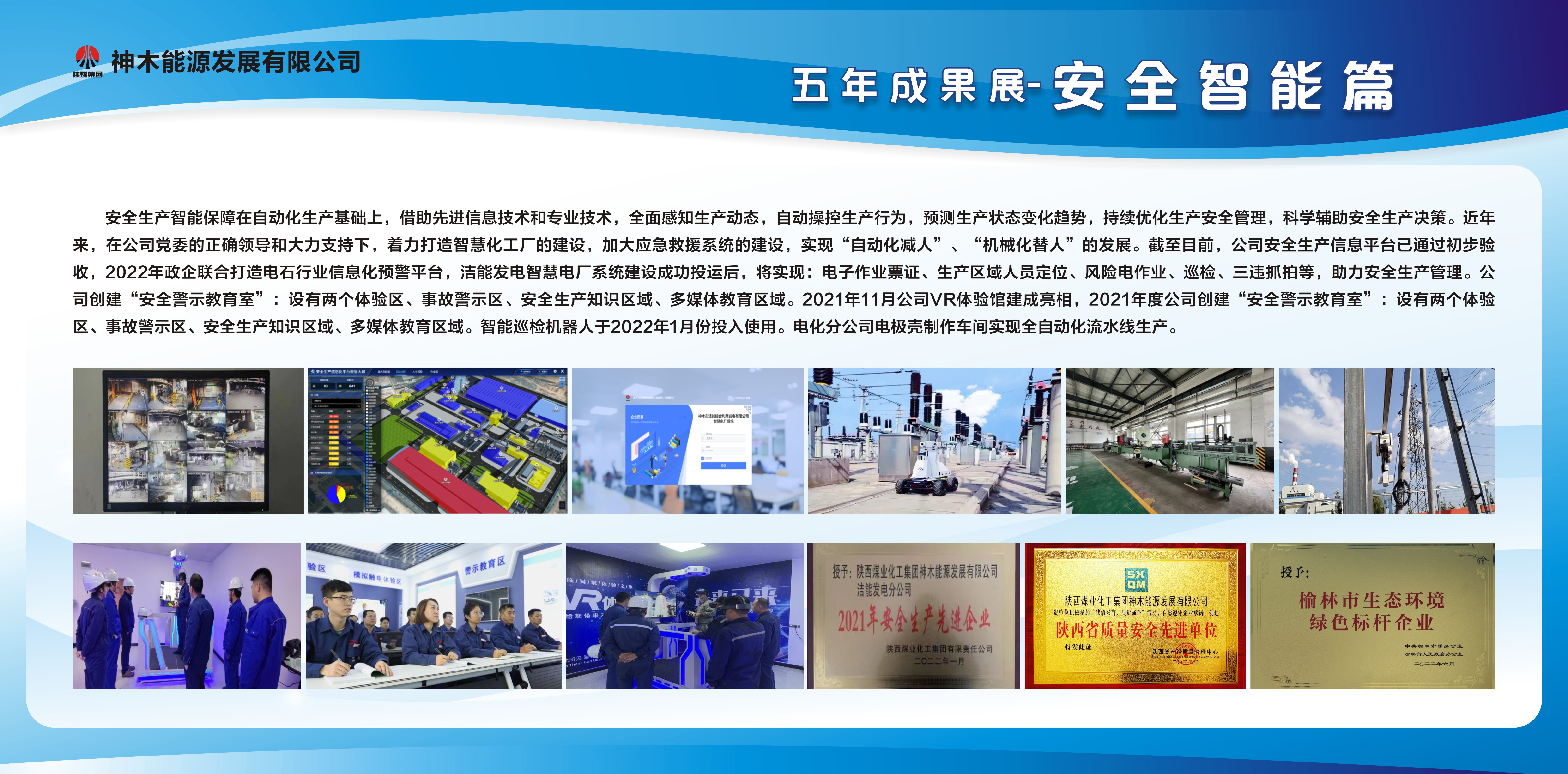 本次成果展生动展现了5年来能源公司在陕煤集团及神木煤化工公司领导下,改革创新、高质量发展的奋斗历程。整个展览分为“党建成果篇”“安全智能篇”“党风廉政篇”“经营业绩篇”“战略发展篇”“技术创新篇”“职工生活篇”等七大版块。总结了5年来,在陕煤集团及神木煤化工公司的正确领导下,能源公司踔厉扬帆、砺砥前行,从五年前的电石连年亏损,到如今的发电、电石、兰炭三大主导产业齐头并进,再到240万吨/年兰炭产业转型升级的全面完成,以匠心和恒心推动企业前行,助力能源公司高质量发展。