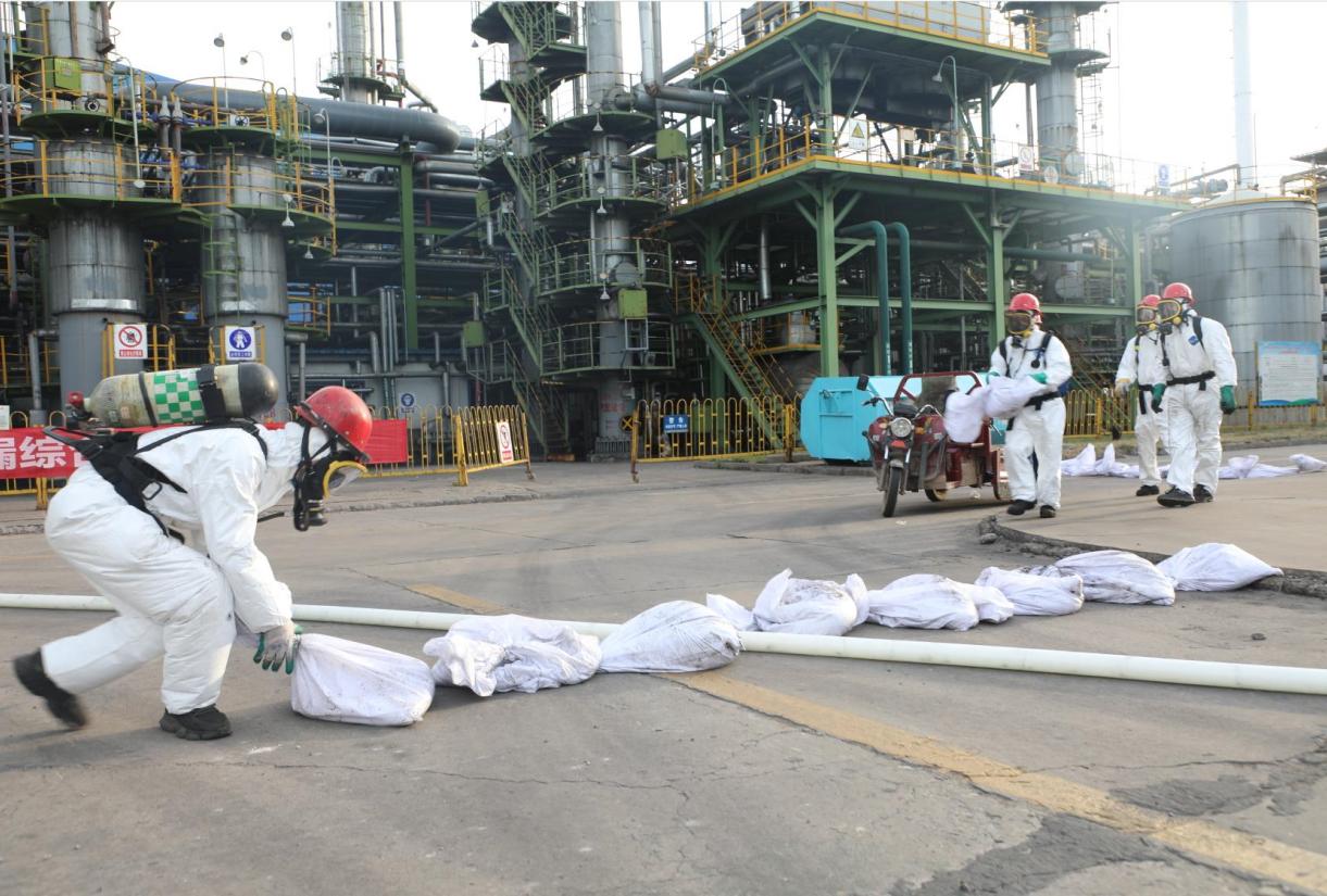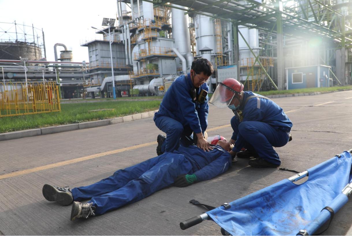 “报告,现场听到有毒气体检测探头报警,一名外来施工人员倒地,请求支援!”“报告调度室,制氢车间硫回收装置发生氨气泄漏事故,请调度室通知上下游车间做好相应防护和人员疏散准备!”“报告,加氢车间应急队员4名,防化服2套,雾化消防水枪头1个,移动消防水炮1台,消防水带4盘,前来救援,请指示!”……随着一声声汇报,演练在紧张有序地开展。保卫警戒组、应急保障组、应急处置组、通讯联络组、物资供应组、事故调查组、生产保障组、现场监测组等应急小组按照应急预案快速响应,有序进行相应的救援工作,各小组听从指挥、统一行动、紧密配合,确保了本次突发事件的及时处置。最终,经过大家的共同努力,圆满完成了此次演练任务。