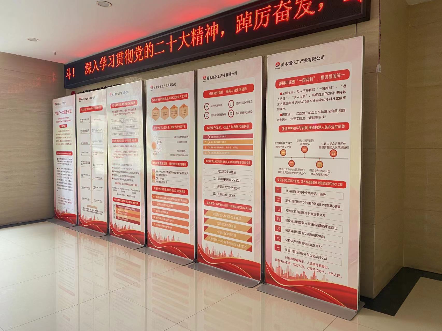 该公司及时更换了电子显示屏,制作了学习宣传贯彻党的二十大精神展板,摆放在人员出入比较密集的电梯口,以“一图速览”的形式,展示了党的二十大报告。展板内容层次分明、脉络清晰可见,方便干部职工利用碎片化时间进行学习,做到易看、易学、易记。