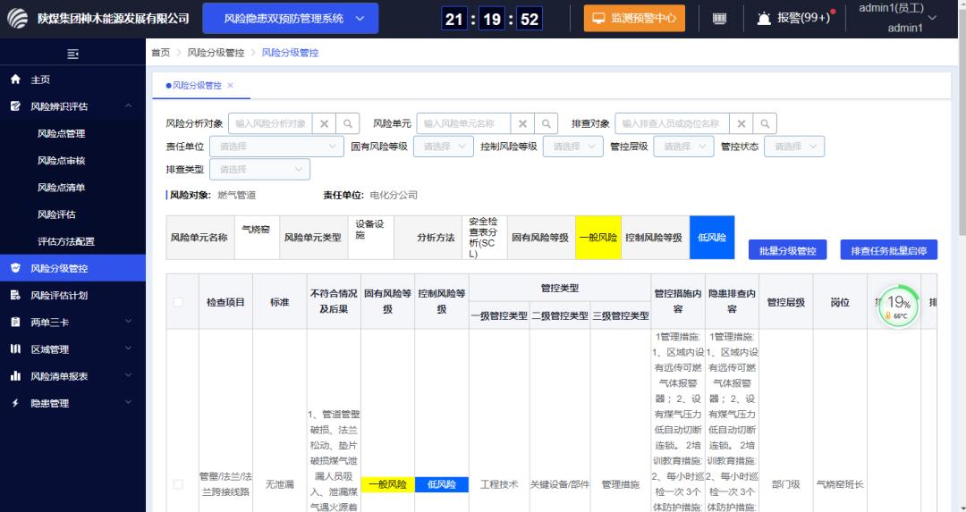 风险分级管控通过《风险评估清单》,系统会自动生成隐患排查工作任务,由指定的排查人员进行现场风险评估确认,如未及时进行隐患排查任务时,系统将会自动在调度指挥中心的三维地图上出现预警提示。
