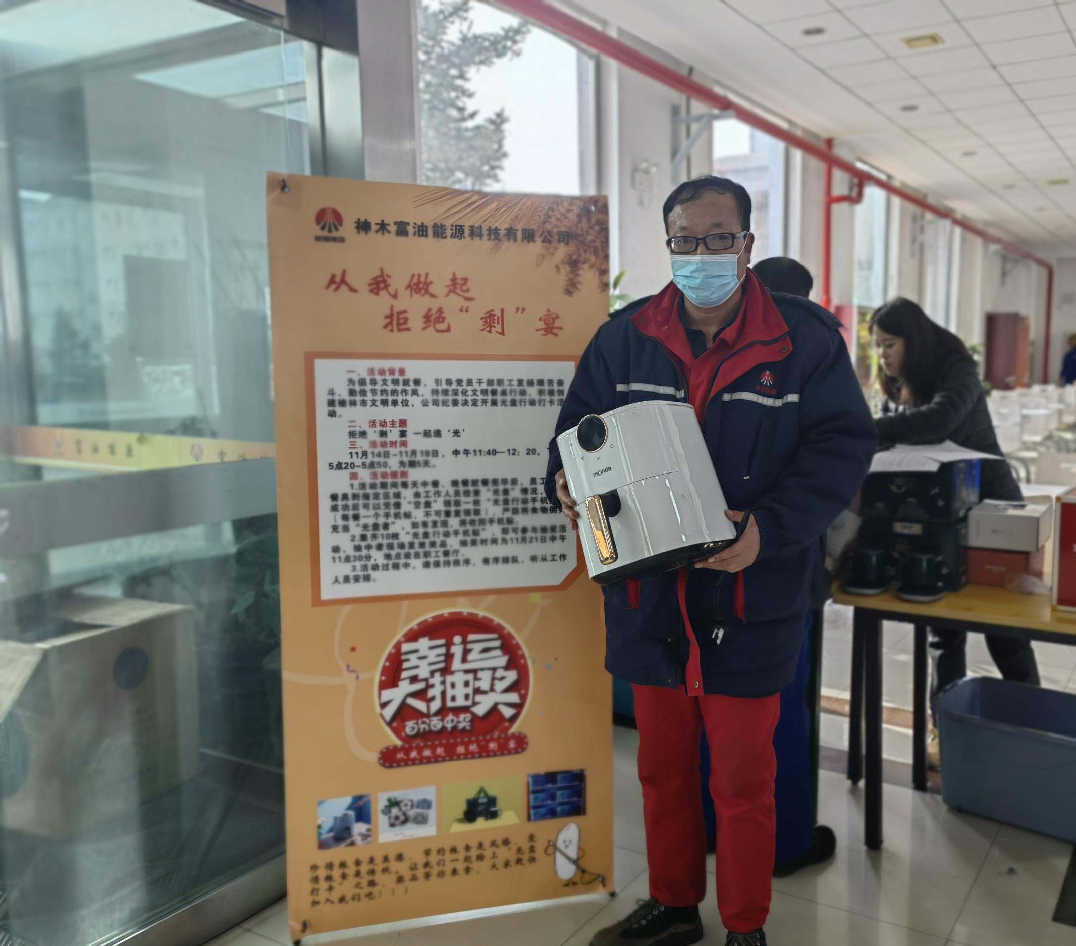 “我已经连续5天光盘,获得了红、橙、蓝、绿、紫五种颜色卡共10张,希望能抽到大奖。”抽奖现场的一名青年员工说。“果然有大奖,今天抽到了老婆心心念的空气炸锅,真开心啊!在今后的工作和生活中,我将用自身的实际行动带动我周围的同事、还有我的家人杜绝舌尖上的浪费。”保运中心苏永红开心的说。