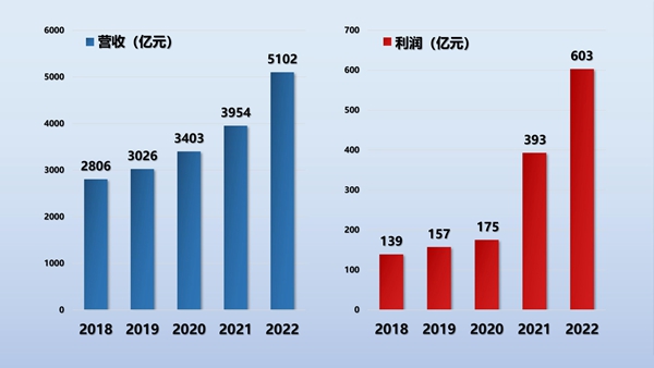 2022年,陕煤集团实现营收5102亿元,比上年同期增长29%,利润603亿元,比上年同期增长53.4%,集团规模效益双双跃上新台阶,安全生产形势持续向好。完成煤炭产量2.33亿吨,化工产品产量1954万吨,发电量515亿度,粗钢产量1217万吨,金融、物流、建材、机械制造板块持续发力。连续8年入围世界500强榜单,位列2022年世界500强第209位,比上年220位前进了11位。位列中国企业500强第67位,蝉联上榜陕企第一,排名稳步提升,展现出良好的成长性。为全国18个省(区、市)提供能源支持,发挥了国有能源企业“压舱石”作用。