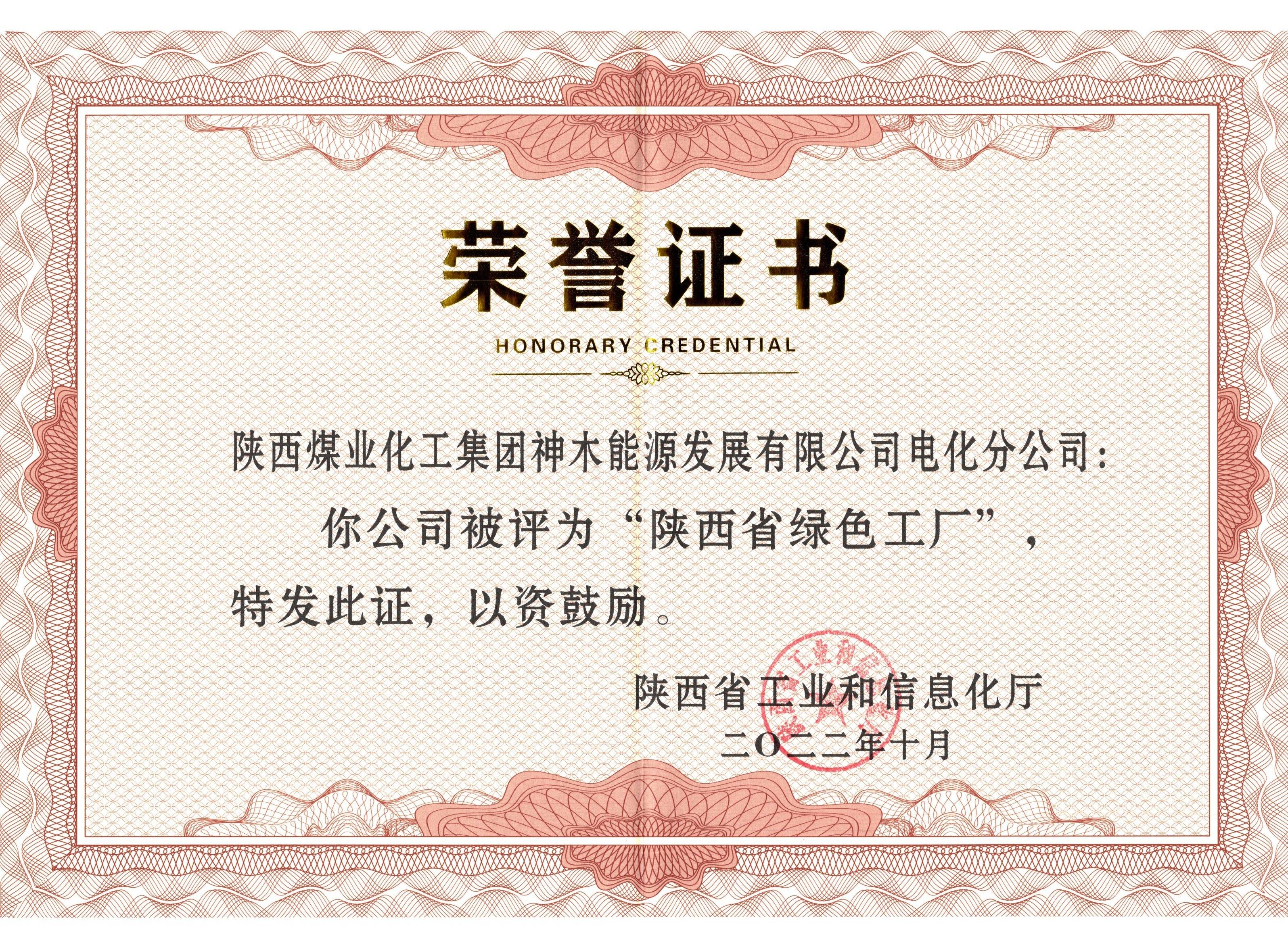 能源公司电化分公司荣获“陕西省绿色工厂”称号