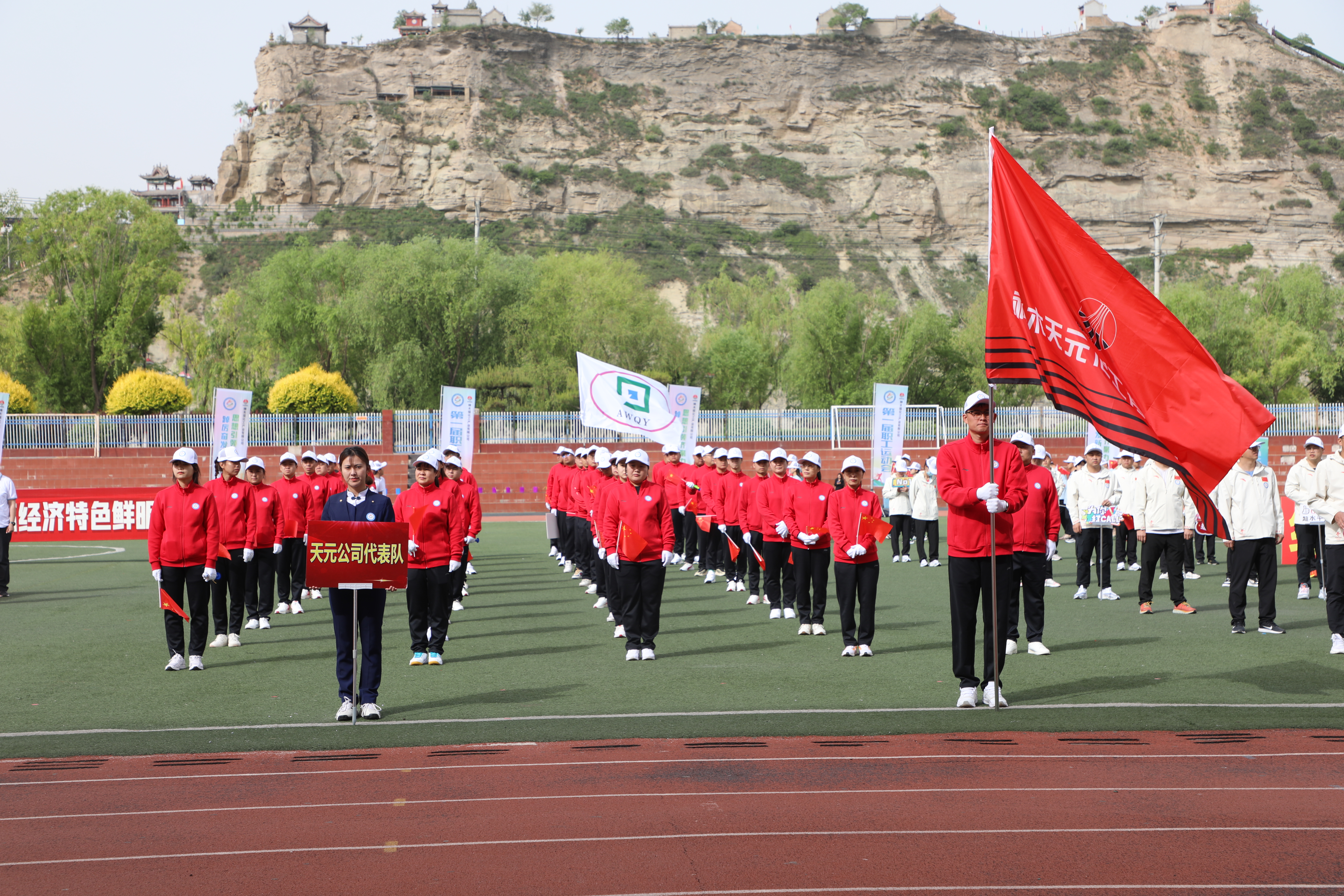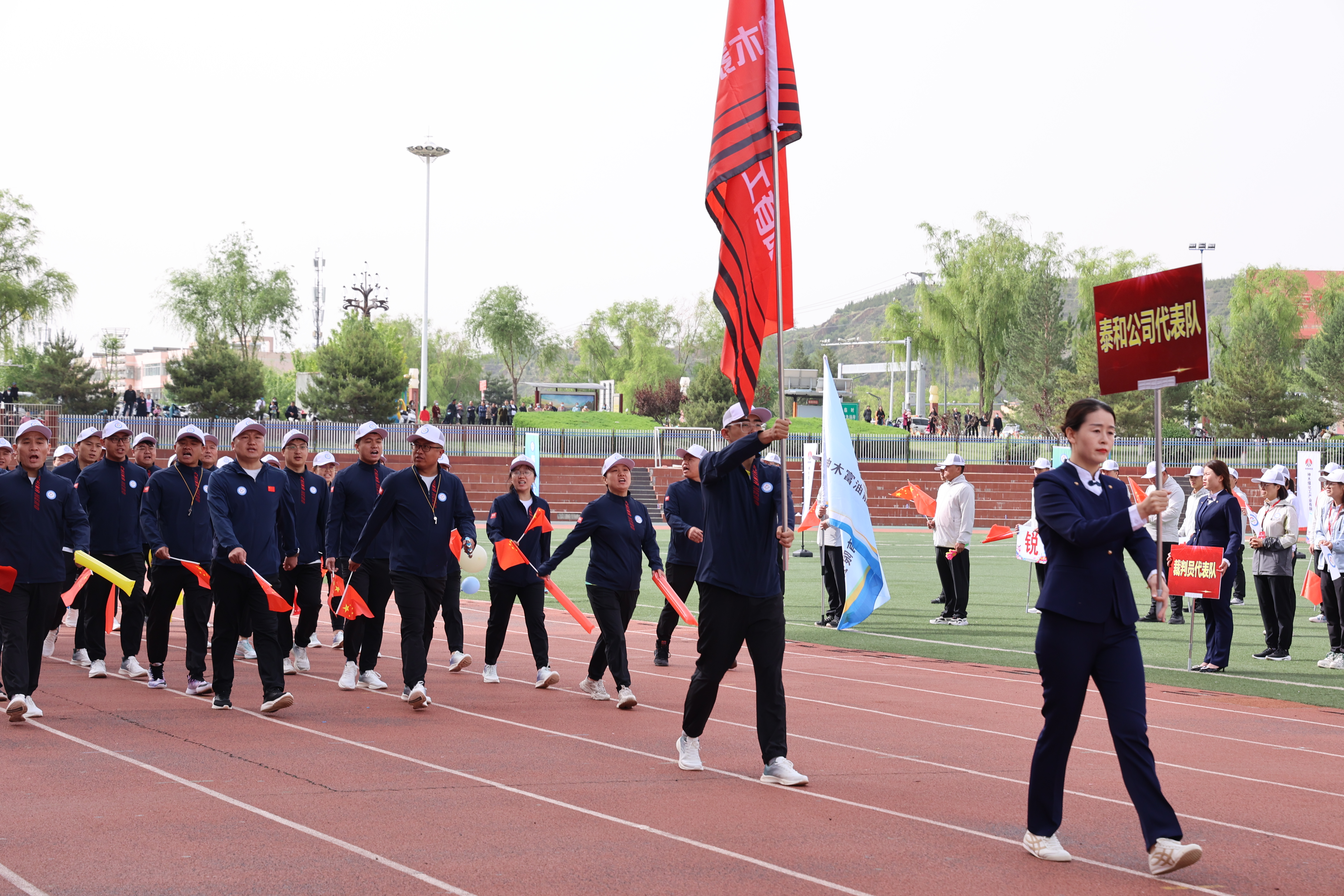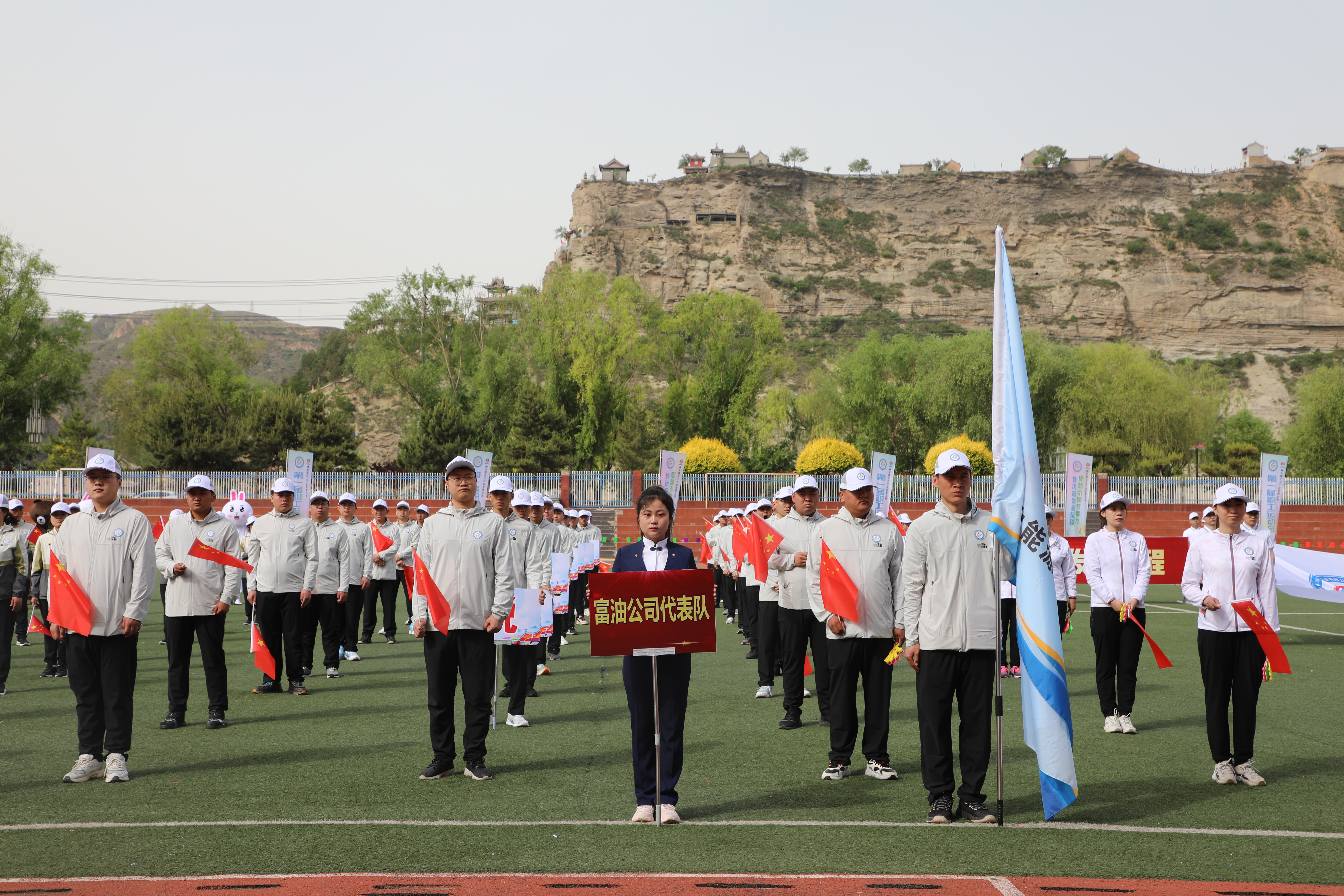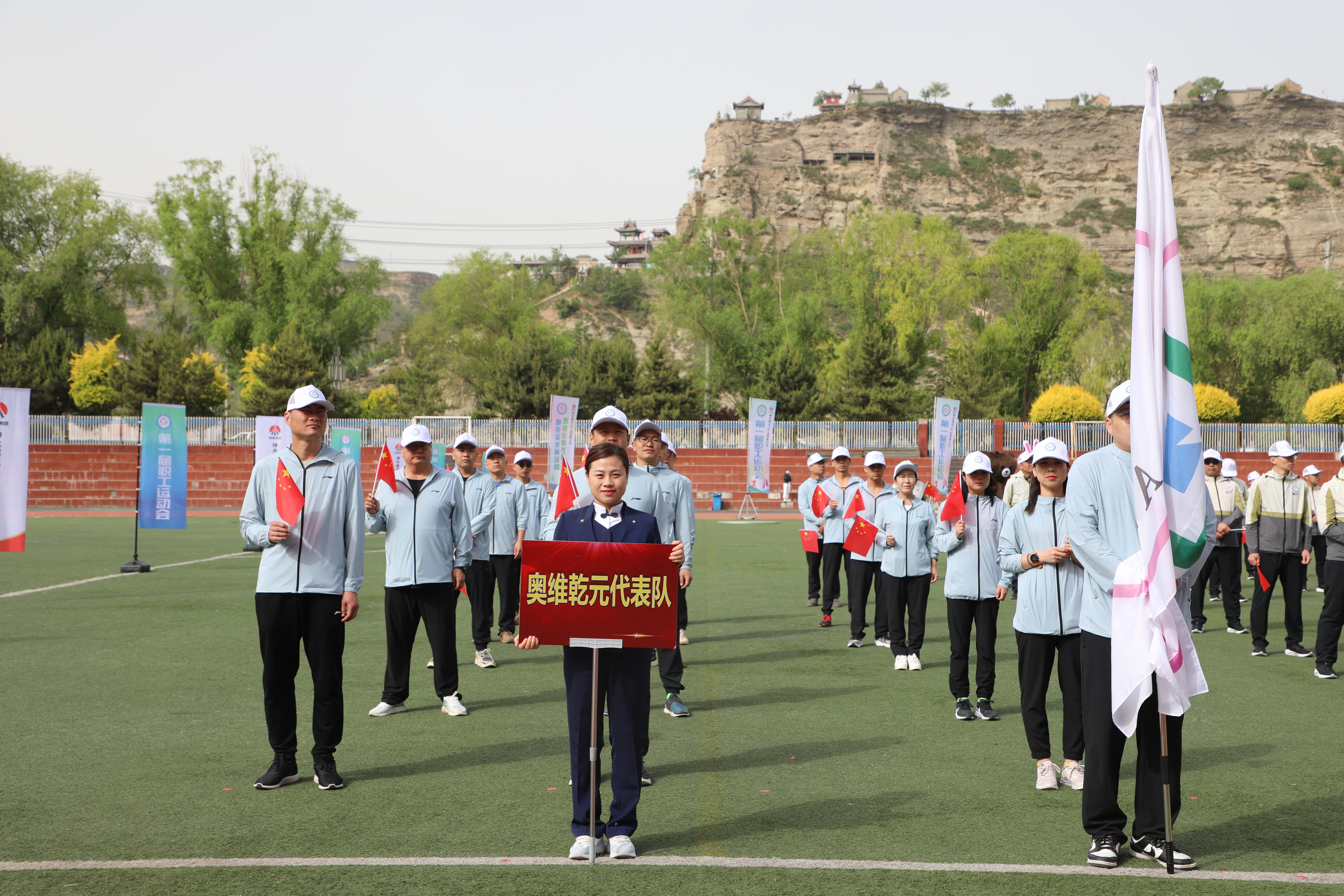 国旗飘飘,彩旗猎猎。三百健儿,神采飞扬。方阵威武,队列从容。英姿飒爽,号子响亮。升旗奏乐,职工肃穆;开幕致辞,掌声轰鸣。天籁之音,讴歌时代;腰鼓表演,震撼全场。领导接力,增进班子团结;呐喊助威,提升干部合力。