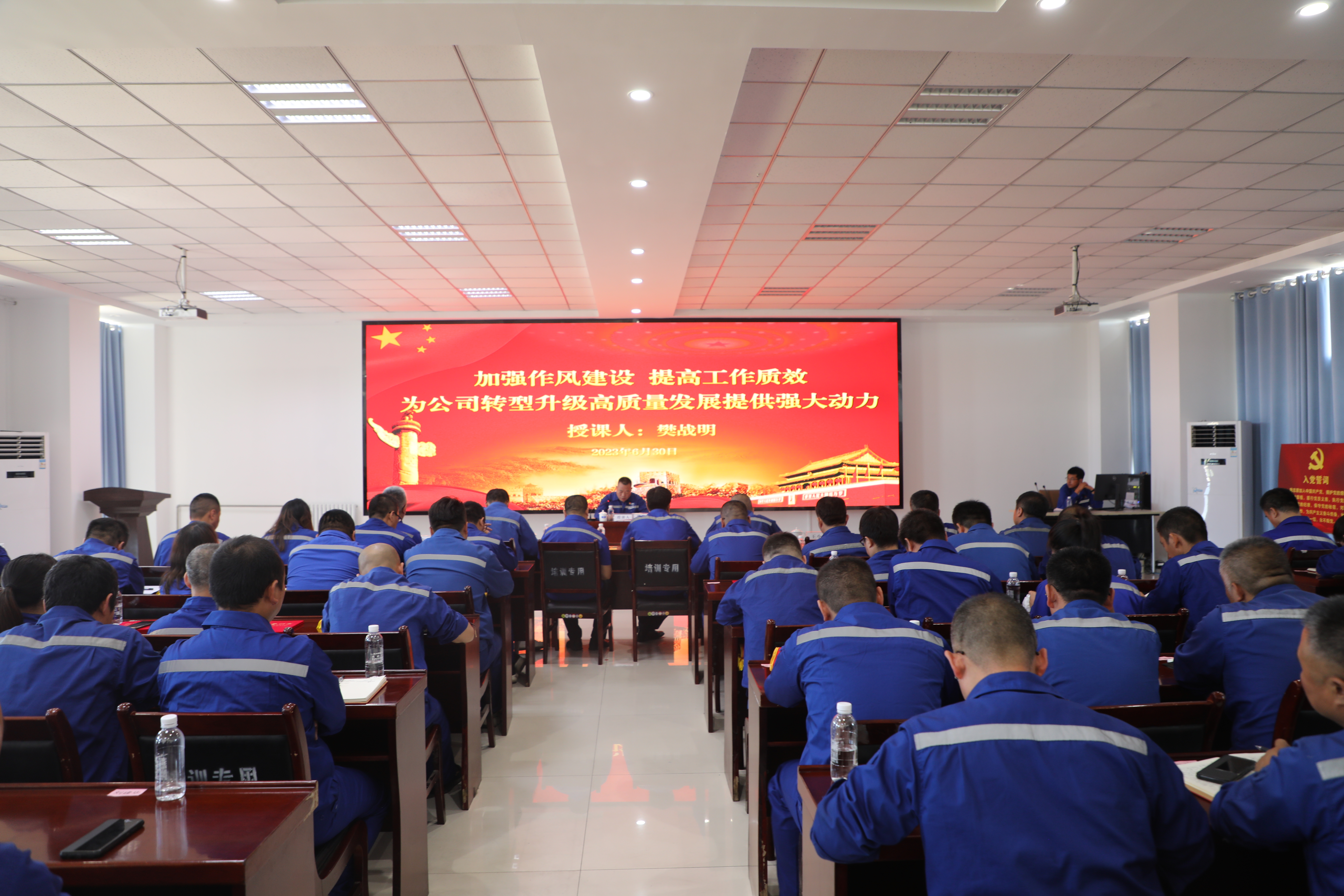 专题党课,转变作风提质效。表彰会结束后,天元公司党委副书记、纪委书记、工会主席樊战明以《加强作风建设 提高工作质效 为公司转型升级高质量发展提供强大动力》为题,给与会人员家讲了一堂生动深刻的专题党课。党课结合公司实际,详细阐释了加强干部作风建设的重要性及主要内容,并从始终保持良好的精神状态、持续加强学习能力提升、全面强化敢于担当的精神、全面深入推进作风转变、始终永葆廉洁守初心五个方面就如何加强干部作风建设提出了具体要求。党课结束后,大家集体观看了廉政教育系列参考片《破防》——政法系统违纪违法典型案件警示录,接受了一次思想和心灵的洗礼,进一步增强了廉洁自律意识。