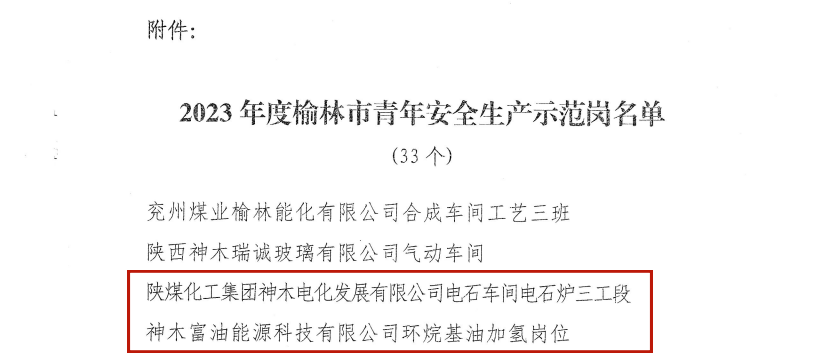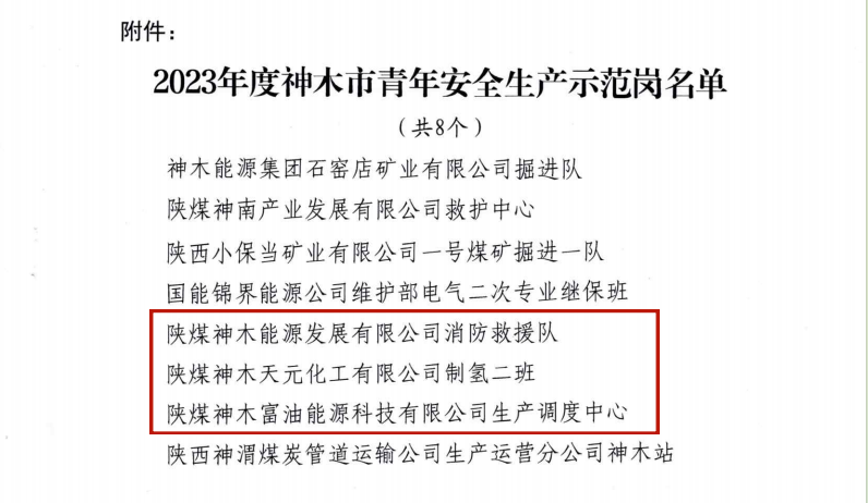 其中,神木煤化工电化公司电石车间电石炉三工段、神木煤化工富油公司环烷基油加氢岗位荣获“2023年度榆林市青年安全生产示范岗”称号。神木煤化工天元公司制氢二班、神木煤化工富油公司生产调度中心、神木煤化工能源公司消防救援队荣获“2023年度神木市青年安全生产示范岗”称号。