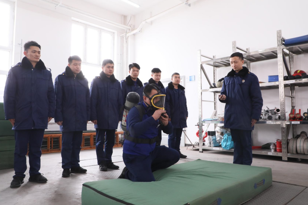 消防队队员在进行原地佩戴空气呼吸器训练