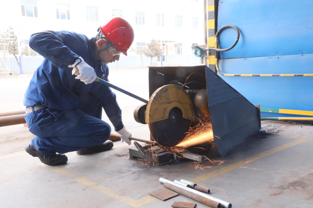 检修车间王西鹤在利用废旧材料制作备用夹具
