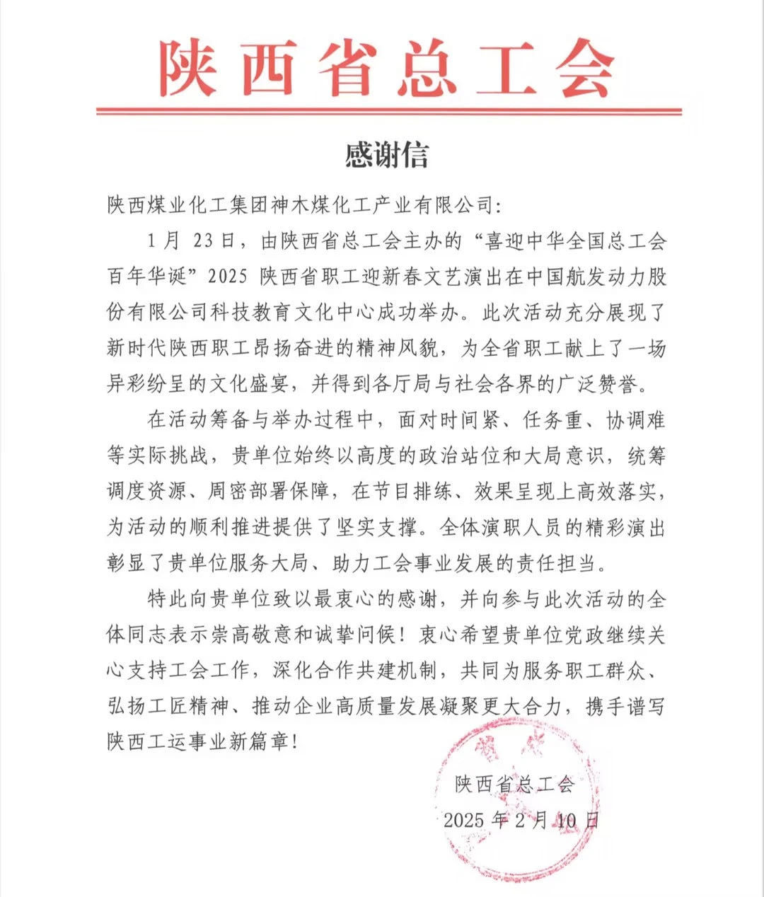 近日,神木煤化工公司收到陕西省总工会的感谢信,信中感谢并高度肯定了公司在“喜迎中华全国总工会百年华诞”2025陕西省职工迎新春文艺演出中的卓越表现。这封情真意切且包含浓浓期许的感谢信,不仅是公司对企业文化建设成果的褒奖,更是对公司服务职工、赋能发展的责任担当的认可。