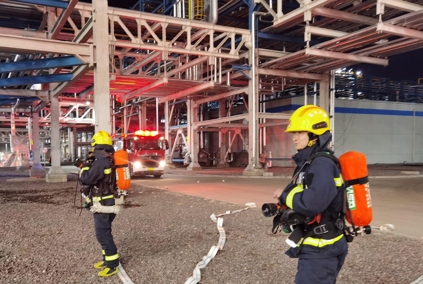 本次演练主要突出6个字,即“实情、实兵、实战”,过程主要包括:先期侦察、区域警戒、搜索救援、指挥调度及安全管控等环节。演练假定环烷基油分离装置(1325)发生火灾,应急救援中心接到“警情”后,立即启动应急救援预案,及时出动救援力量赶赴现场,经侦察发现,“起火点”位于装置东南侧,大量烟气向四周扩散,无人员被困。充分掌握了“现场情况”后,各个参战小组根据分工立即突入战斗,协同作战。经过一个多小时的紧急处置,“火势”被成功扑灭,演练圆满结束。