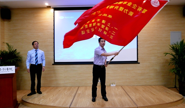 最后,付战超向学员代表王玮授本期培训班班旗。旗帜上印有“班级公约”:一是上课不拿手机;二是课堂不随意走动;三是研讨不说空话。