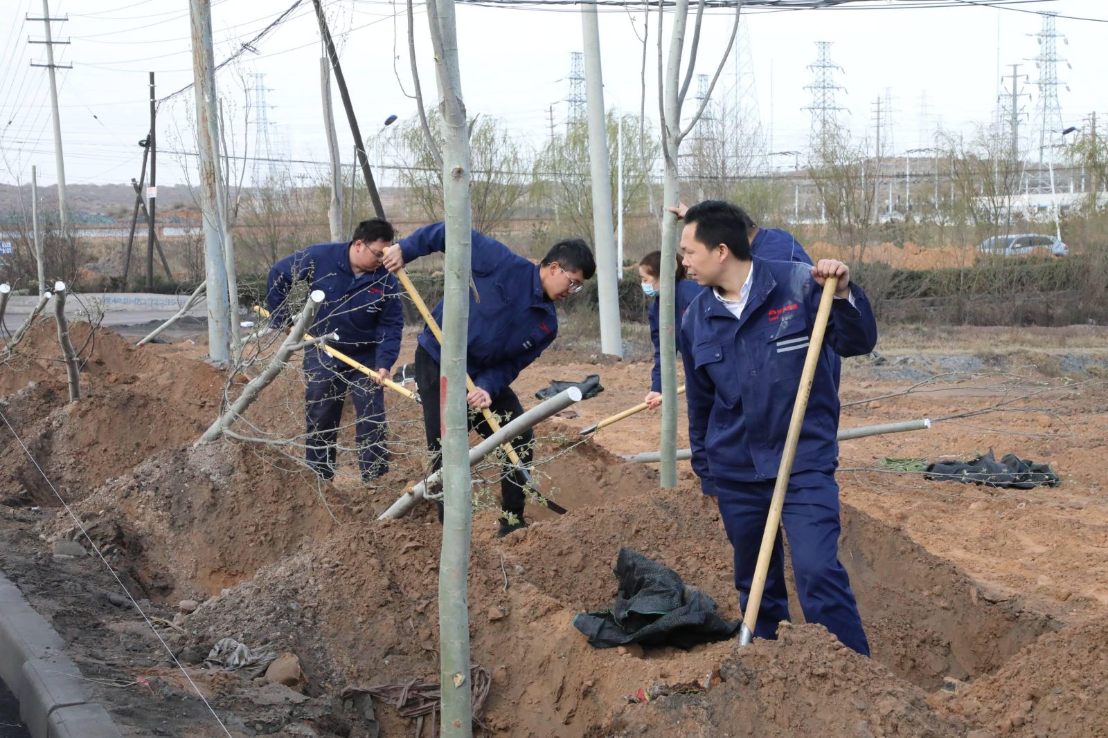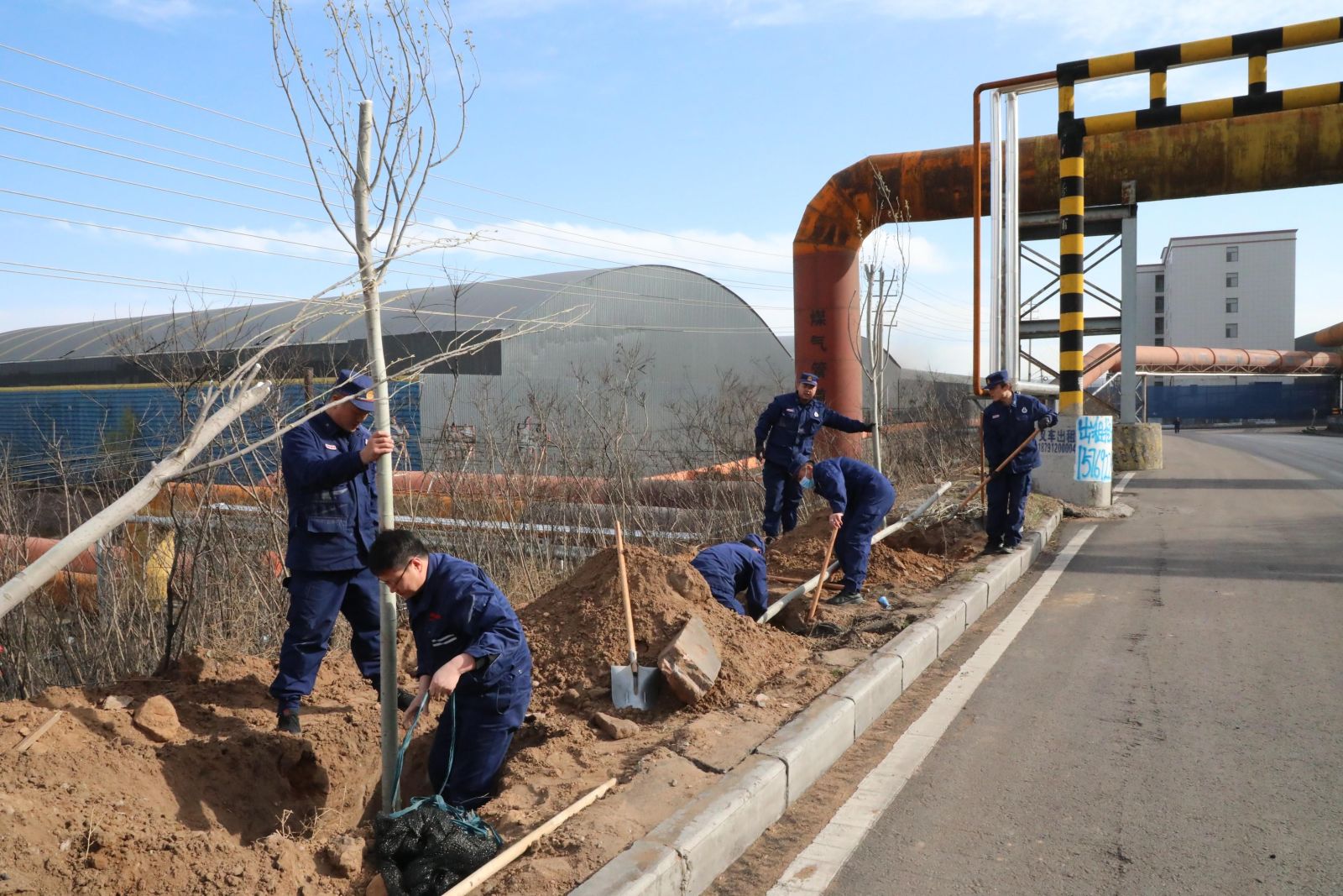 活动现场,党旗飘扬,党员干部、职工充分发扬不怕脏、不怕累的精神,大家干劲十足,挖穴、扶苗、填土、踩实、浇水,每道工序都一丝不苟、各个环节配合得非常默契,合力栽下一颗颗绿化树苗,生动展示了党员干部争做生态文明建设先锋的良好形象。经过一上午的努力,200余株杨树苗整齐成行,生机盎然地矗立在风中,新栽种的绿化树苗在道路两旁构成一道亮丽风景线,为厂区增添了一片新绿。