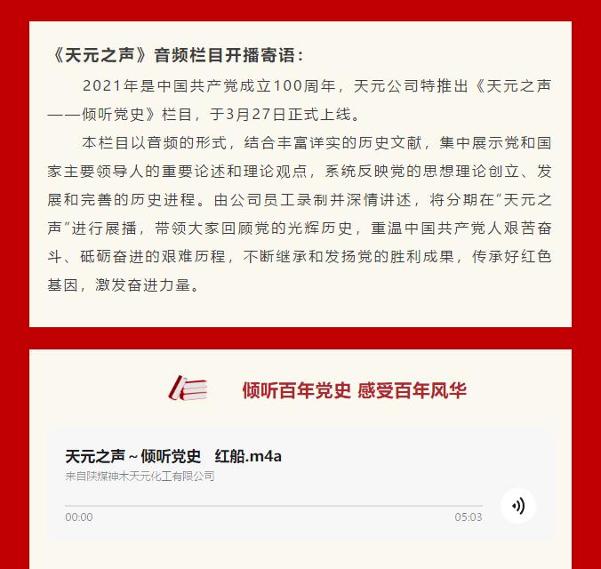 采取多种形式强化党史学习教育宣传,充分利用各类媒体平台深入宣传习近平总书记在党史学习教育大会上的重要讲话精神,在厂区醒目位置设置宣传展板、悬挂横幅标语,在天元公司微信公众平台开设“天元之声—倾听党史”党史诵读专栏,该栏目以音频的形式,结合丰富详实的历史文献,由员工录制并深情讲述,同时每天利用广播在上下班时间循环播放,已连续更新30期。各党支部包联领导围绕“学党史、悟思想、办实事、开新局”深入支部开展集中宣讲,各党支部书记围绕百年党史讲专题党课,组织各党支部开展党史学习教育板报展等,在全公司营造浓厚的党史学习教育氛围。