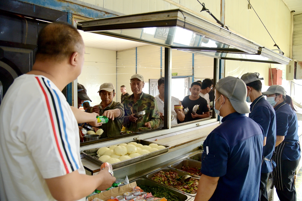 一大早,食堂师傅就开始忙活,为大家精心制作炖肉、洋葱炒肉、凉拌豆角、黄瓜拌猪头肉,烧制了蛋花汤,并配备了桶装饮料和西瓜。瞧,大家吃着节日的美味,脸上洋溢着甜蜜的笑容。