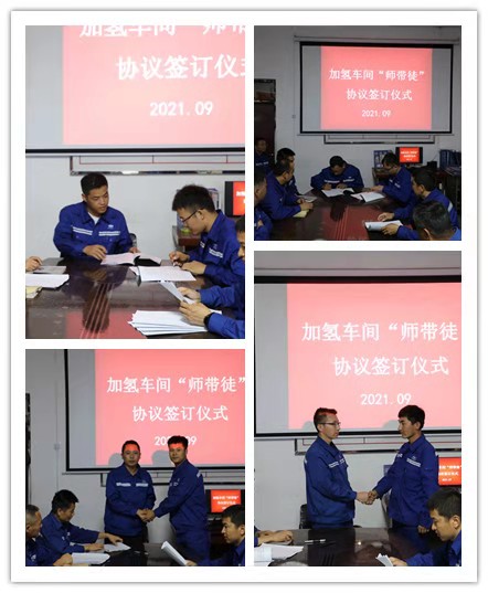 在签订仪式上,车间主任杨春明宣读了《加氢车间“师带徒”活动实施方案》,明确了活动开展的形式、考核方式等内容。随后,10对新老员工通过签订“师带徒”协议结下了深深的师徒情。协议明确了师徒双方的权利和义务,协议期满,师徒需要共同提出出师申请,车间工艺、安全、设备等相关专业组考核合格后,方可出师。