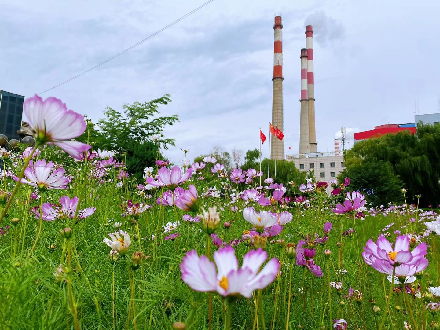 绿荫、草地、办公楼前金菊和矮牵牛间错种植,芳香四溢,生活区一簇簇格桑花竞相开放,蜂蝶飞舞,电石生产区、化验楼前到处鲜花盛开、绿满枝丫。