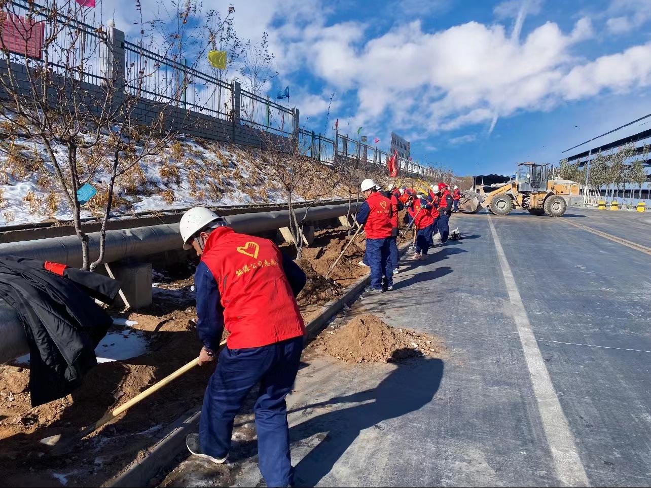 主题党日活动中,电化党支部宣传委员对人员进行了简单分工,为大家派发了衣服、手套等工具,大家身着红色志愿服整齐有序的前往冷却车间外绿化带进行清理杂物、杂草、翻地。“以红色力量助力绿化过冬,为明年的厂区绿化打好基础。”的口号在队伍里喊起,一时间,大家卯足了劲,在绿化带中穿梭着,干的热火朝天,丝毫没有因冬天的低温而降低劳动热情。经过两个多小时的共同劳动,绿化带由原来的杂草枯叶变得干净整洁。