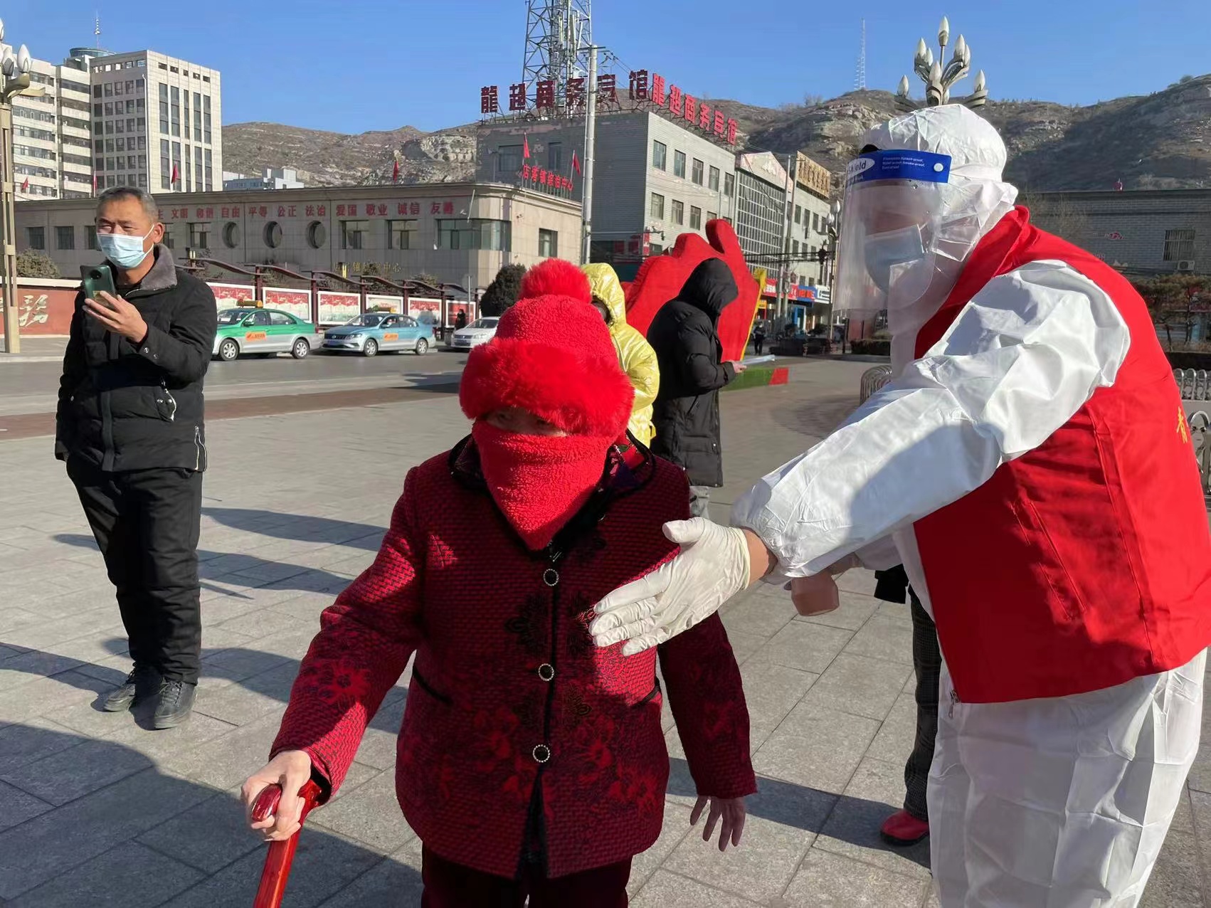 “奶奶,我们是神木电化的青年志愿者,最近西安疫情严重,您一定要少去人员聚集的公共场所,出门一定要戴好口罩,这是给您的口罩和免洗消毒凝胶,要勤洗手,保护好自己。”志愿者陈波一边向扶着老人领取物资,一边给老人进行疫情预防的细致讲解。