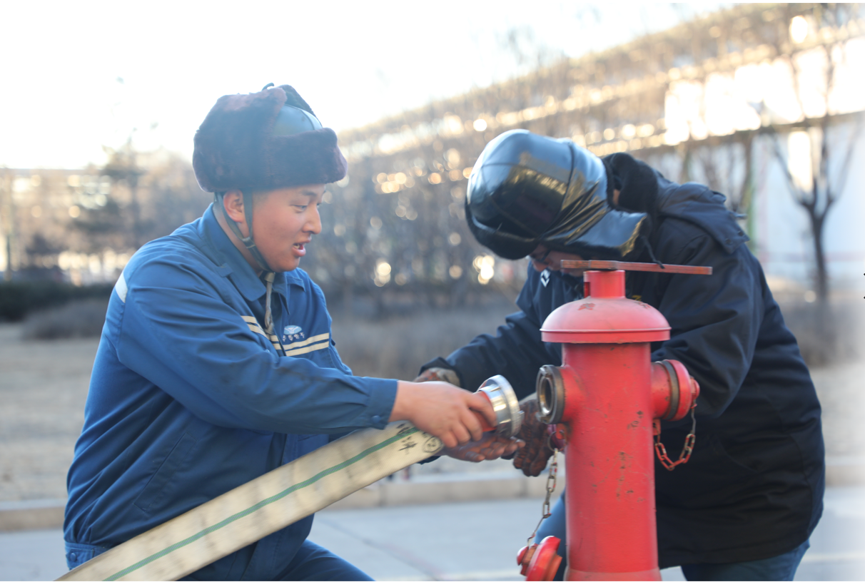 个人比赛中,各参赛选手反应敏捷,动作迅速,操作有条不紊。团体比赛中,各参赛队伍分工明确,配合默契。天气虽然寒冷,但各参赛队员依旧热情高涨,争分夺秒,齐心协力,一鼓作气把比赛推向了高潮。经过激烈的比拼,最终,万勇获得空气呼吸器使用比赛第一名,王宇超、平星星获双人组防化服佩戴比赛第一名,制氢一班获五根水带连接分水器和消火栓比赛第一名。